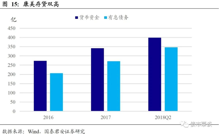 (1)康美连续近三年出现存贷双高现象。康美自2016年1月1日至2018年6月30日,康美账面货币资金畸高近三年,在2016年年度报告中虚增货币资金225.48亿元,占同期总资产的41.13%和和净资产的76.74%,在2017年年度报告中虚增货币资金299.44亿元,占同期总资产的43.57%和净资产的93.18%,在2018年半年度报告中虚增货币资金361.88亿元,占公司总资产的45.96%和净资产的108.24%。