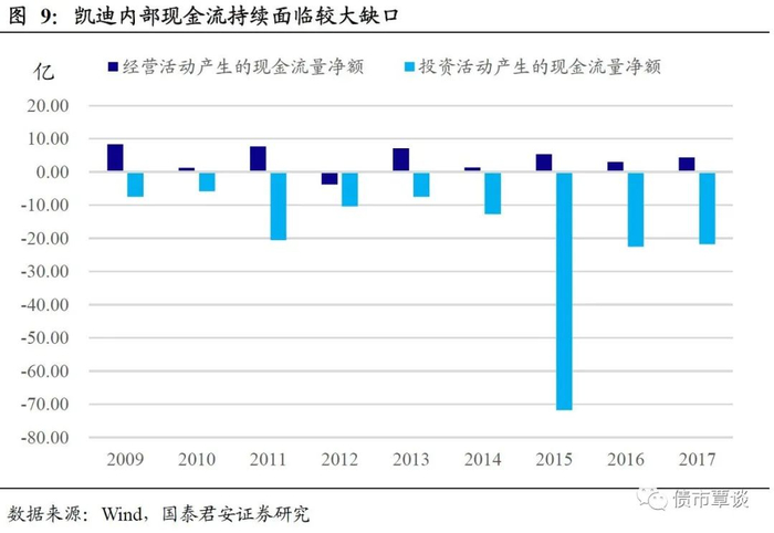 凯迪生态为生物质发电行业的龙头上市民营企业,近年来管理层对行业趋势判断过于乐观,致使公司战略较为激进,扩张速度过快。自公司2018年5月7日首次发生违约以来,目前累计5只债券实质违约,发行规模合计39.8亿元,2只债券展期。在违约发生后,2018年5月7日,中诚信国际迅速将公司评级下调至C。