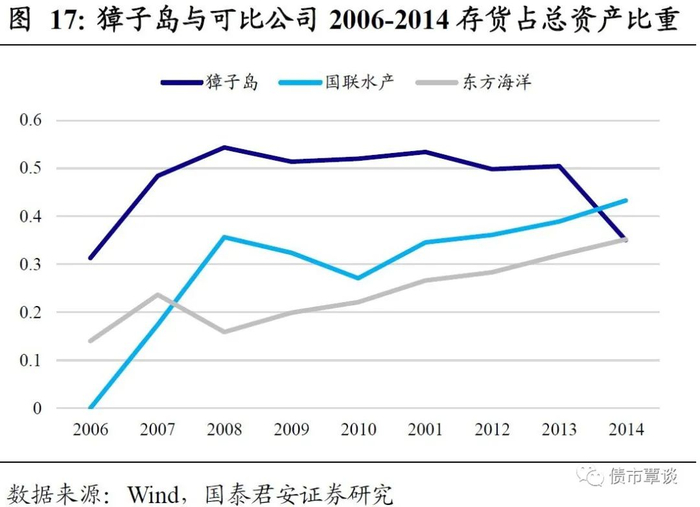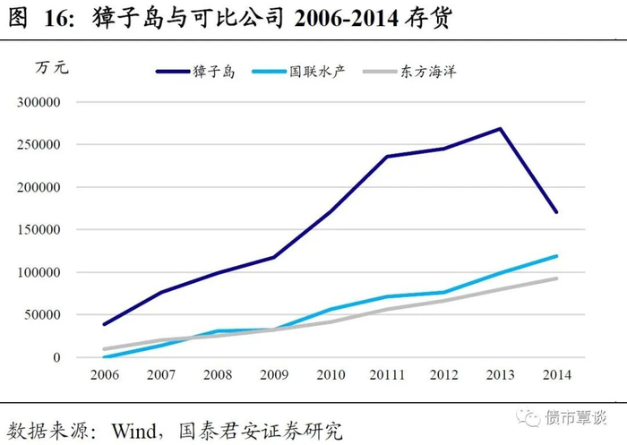 (1)存货在2014年前长期居高不下,且存货占比较高于同行业其他公司。自2006年来,獐子岛的存货一路增长,且存货占比较高长期在50%水平左右波动。2006-2008年,存货规模在10亿元以下,分别为3.89亿元、7.63亿元、9.9亿元,总资产占比为31.41%,48.41%,54.41%,2009-2010年期间,存货规模增至10亿元上,分别为11.73亿元和17.16亿元,总资产占比为51.37%和46.3%,2011-2013年,存货规模升值20亿元以上,分别为23.58亿元、24.5亿元、26.84亿元,总资产占比为53.35%、49.77%。直至2014年獐子岛第一次宣称扇贝死亡导致存货大幅减值前,公司的存货一直高企,同时尽管渔业企业的存货占比较高属于正常现象,獐子岛的存货占比也依旧高于同行业其他公司水平,由此可窥探出公司虚增存货的端倪。