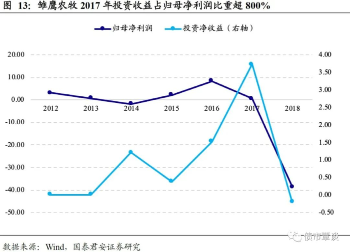 雏鹰农牧涉嫌通过可供出售金融资产,确认高额的投资收益来调节利润。2018年6月13日自媒体“市值风云”曾发文质疑雏鹰农牧的财报质量,文章指出,公司通过泽赋基金投资多家资质不明的公司,短时间持有之后迅速高溢价抛售,回笼资金,通过“可供出售金融资产”项目美化公司业绩。根据公司2017年年报,在归母净利润仅为0.45亿元的情况下,投资净收益高达3.73亿元,占归母净利润比例超过800%。