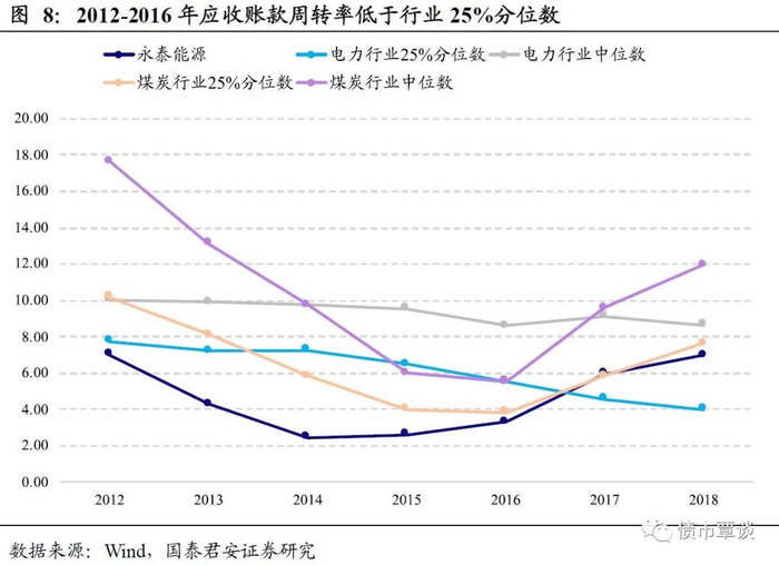 (3)应收账款营运能力弱,欠款方集中度极高。2012至2015年间公司应收账款增长迅速,从2012年末的16.36亿元持续上升至2015年的47.42亿元,应收账款周转率低于煤炭行业25%分位数、电力行业25%分位数,营运能力较弱,2015年前五大欠款方应收账款占应收账款总额比例超过95%,集中度极高,鉴于公司复杂的上下游关系和隐秘的关联网络,不排除公司以高于市场价的售价将产品赊销给子公司,虚增收入,导致应收账款虚高的可能。