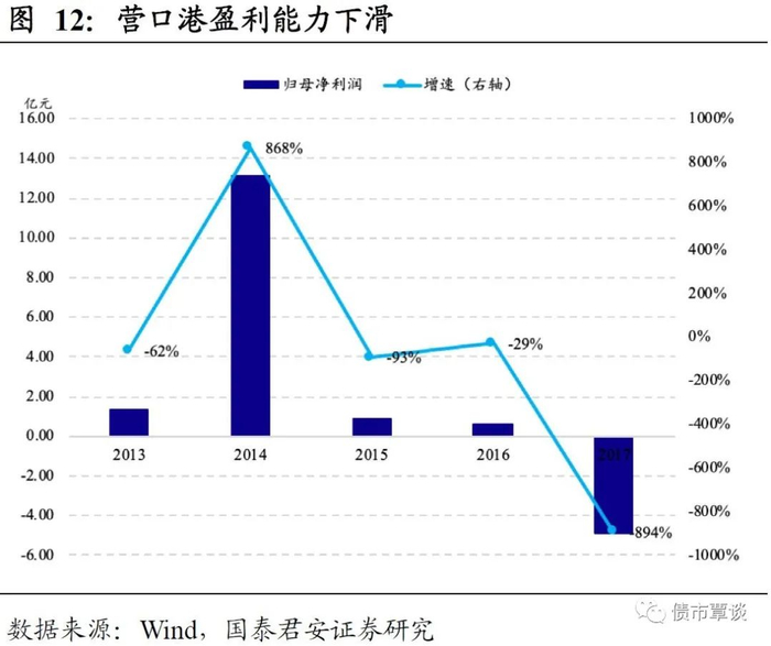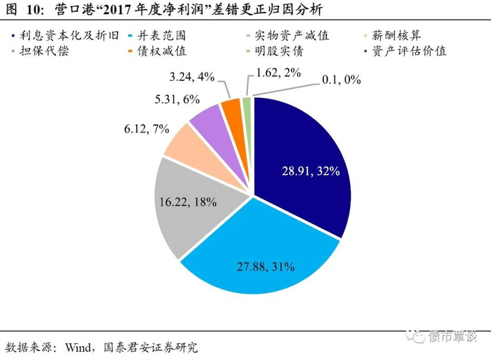 营口港就是典型代表。营口港务集团是一家主营货港及船港业务的东北地方国企,下属有核心上市子公司营口港务股份有限公司,截止目前,母子公司所发行债券均未出现违约。营口港务集团在2019年4月30日发布2018年度审计报告时,对前期财务数据进行差错更正处理,更正后2017、2018年归母净利润分别为-94.73亿元(更正前:-4.92亿),-49.05亿元,2017年年底资产合计833.72亿元,负债975.25亿元,资不抵债,出现财务黑洞。这一事件未对营口港的主体评级造成影响,目前中诚信国际、大公国际仍对公司维持AA+的评级。