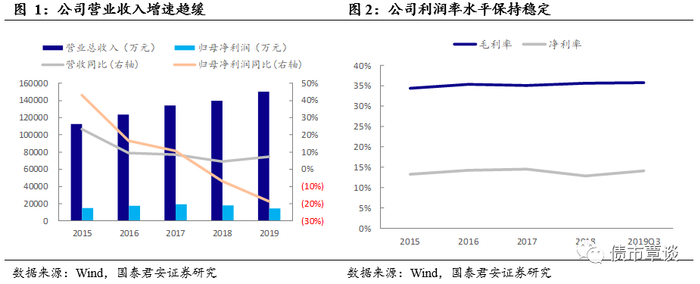 公司是国内儿童用品行业知名品牌运营商。公司主要产品为童鞋、童装及儿童服饰配饰,致力于为孩子提供健康、舒适、高性价比的儿童用品,打造卓越的儿童服饰行业领导品牌。公司始终坚持创新,丰富的产品线满足了消费者对品牌儿童服饰一站式购物体验和全品类购物需求。公司业绩快报显示,2019年公司实现营业收入15.02亿元,同比上升7.41%,归母净利润1.47亿元,同比下降18.76%。公司毛利率相对稳定,2019年三季度公司的毛利率和净利率分别为35.86%和14.18%。