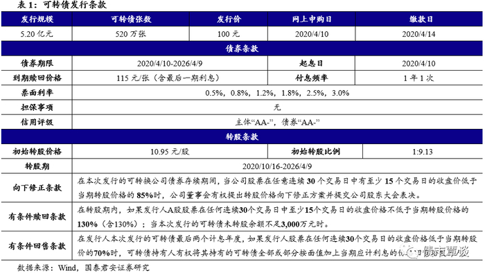 发行信息:本次转债发行规模为5.20亿元,网上申购及原股东配售日为2020年4月10日,网上申购代码为“754557”,缴款日为4月14日。公司原有股东按每股配售1.096元面值可转债的比例优先配售,配售代码为“753557”。网上发行申购上限为100万元,主承销商东兴证券最大包销比例为30%,最大包销额为1.56亿元。