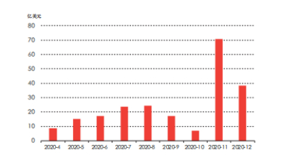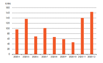 中资美元债2020年到期规模。根据Bloomberg的数据,截至2020年4月9日,中资美元债有879亿美元在2020年二至四季度到期(另有回售金额51亿美元),平均每个季度到期293亿美元。其中,二季度和四季度是到期高峰,到期规模分别为302亿美元和350亿美元(见图4)。