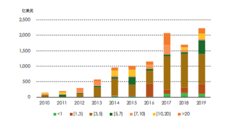期限结构分析。根据Bloomberg的数据,中资美元债的发行期限以3—5年期为主。2019年,5—7年期美元债发行规模同比显著增长(见图2)。2020年以来,房地产、城投、金融行业的美元债发行期限继续呈现普遍较长的特点,大多在3年以上。