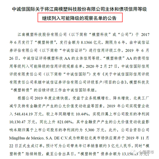4月17日,中诚信国际公告称,维持模塑科技(000700.SZ)主体信用等级AA,维持“模塑转债”的债项信用等级AA;并将其主体及债项信用等级继续列入可能降级的观察名单。