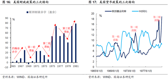 伴随着70年代的三轮通胀高峰,美国的财政、货币政策也发生了三次转向。60年代中后期,约翰逊赤字引发了1970年第一轮通胀高峰,因此当时的尼克松政府采取了财政、货币紧缩措施,经济陷入衰退。1971年,美国财政、货币政策重新宽松,以托底经济。