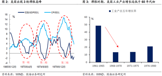 60年代末至70年代,美国经济呈现出两个特点:一是“滞”,实际产出增长放缓。二是“胀”,通货膨胀高企。美国的“滞胀”并非一蹴而就,而是呈现出阶梯式的演变路径。1970年、1974年、1980年,美国共爆发了3轮滞胀高峰。
