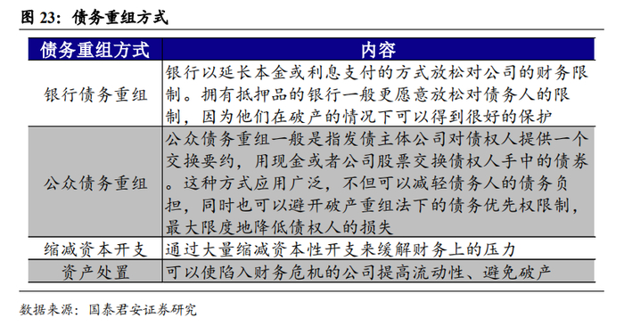 具体来看,债务重组分为银行债务重组、公众债务重组、缩减资本开支和资产处置等方式。当美国高收益债券违约时,很多投行与企业困境投资基金(又称“秃鹰基金”)就会参与进来,首先利用较低的拆借利率与宽裕的资金进行高杠杆融资,投向发展前景良好的债务违约公司,借助债务减记谈判和投资入股等方式解决债务违约问题;然后一方面缩减资本开支、另一方面进行资产处置,以盘活企业资金、恢复正常经营;最后通过资本运作使公司上市、或进行公司出售以获取高额回报。