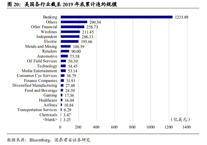 金融业是美国公司债违约的高发地带。按照巴克莱4级行业分类,截至2019年底,美国银行业、其他金融业、有线电视等行业累计违约规模较大,其中银行业以1235.89亿美元违约规模高居首位,占全部违约规模比重逾四成。总体看,美国银行业和非银金融对债券违约的贡献较大。