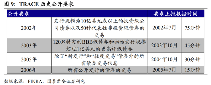 首先,交易双方在交易场所达成交易后,需要将数据上报到TRACE。为了提高公司债券市场的透明度以及满足监管的要求,美国金融业监管局(FINRA)于2002年7月推出了TRACE(Trade Reporting andCompliance Engine system)系统,无论是在交易所市场还是在OTC市场达成的交易都需要报告到该系统。在纽交所债券平台达成的交易实时上传到TRACE系统,在OTC市场达成的交易根据目前最新的要求,需要在15分钟内报告TRACE系统,由TRACE选择性地披露债券品种、价格和成交数量等基础数据。