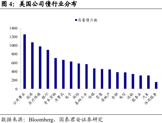 从行业分布来看,公用事业及能源行业存量债规模最大。根据美林行业分类,存量债数量排名前5的行业包括公用事业、能源、医疗、银行和资本货物,其中公用事业和能源行业存量债分别达到1257只、1074只。存量债规模较高的行业多为能源等资本密集及技术密集型行业,需要较大的资金支持研发。服务业、汽车、休闲等行业存量债规模最少,分别为310只、310只、161只。