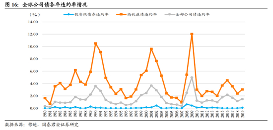 根据穆迪的统计,2019年全球公司债违约率1.5%,较2018年的1.1%有所提升,主要受石油天然气和电信等行业拖累。分券种看,高收益债违约率由2.4%升至3.0%,投资级公司债违约率由0.0%微升至0.06%。尽管2019年全部公司债和高收益债的违约率较2018年均有所上升,但均小于1983年以来年度平均违约率(1.6%和4.1%)。从历史上看,1980年以来,全球出现过几次违约潮:1990年、2001年和2008年。其中,1990年主要由于美联储内部加息,美国经济陷入衰退并叠加海湾战争所致;2001年互联网行业泡沫破灭引起相关企业信用状况恶化;2008年美国次贷危机席卷全球造成大规模违约。目前全球正受新冠疫情冲击,餐饮、酒店、航空等行业影响为甚,穆迪最新预测2020年底全球违约率将达3.6%,其中高收益债违约率预计在6.5%-18.3%。
