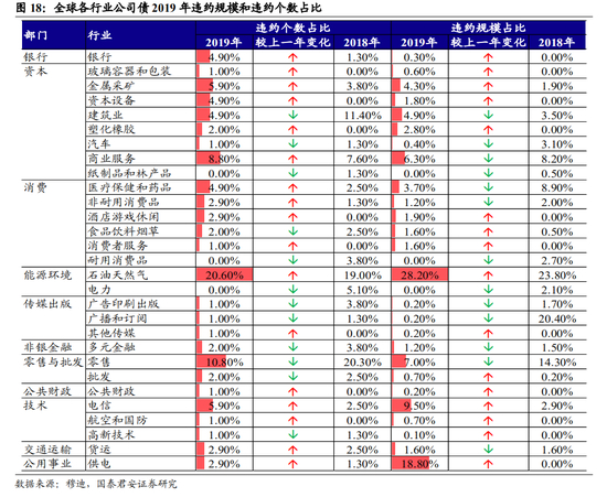 从全球看,石油天然气行业对违约的贡献最大。从违约个数的行业分布看,石油天然气、零售、商业服务2019年违约个数占比较高,分别为20.6%、10.8%和8.8%,但零售业违约个数占比较2018年却大幅下降。从违约规模的行业分布看,石油天然气、供电、电信、零售业2019年违约规模占比靠前,分别为28.2%、18.8%、9.5%和7%,除零售业外,其余三个行业违约规模占比均较2018年有所提升,相关行业风险较高。