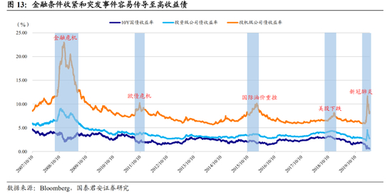 投机级债券收益率容易受到风险事件和金融条件收紧冲击,波动性较大。高收益债券发行主体信用资质较差,一旦外部环境恶化,投资人风险偏好降低,容易引发抛售潮,导致债券收益率骤升。一般来说,国内外突发事件和金融经济条件收紧是两大冲击因素。比如2011年欧债危机和2020年新冠肺炎疫情,这类突发负面事件增加了市场不确定性,直接导致高收益债估值受挫;又如2008年金融危机引发违约和破产潮,外部环境收紧,市场避险情绪高涨,直接造成高收益债收益率飙升至历史高点。