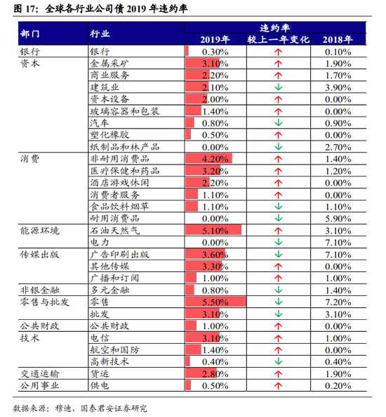 从不同行业违约率看,2019年零售、石油天然气、非耐用消费品违约率排名靠前,分别为5.5%、5.1%和4.2%,纸制品和林产品、耐用消费品、电力行业2019年均未出现违约。从违约率的变化情况看,其他传媒、非耐用消费品、酒店游戏休闲、电信等行业2019年违约率增加较多;电力耐用消费品、广告印刷出版等行业违约率下降明显。