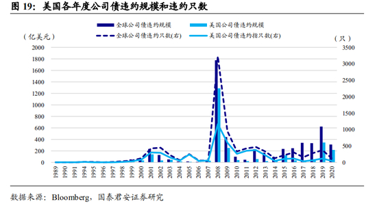 美国公司债违约规模占全球比重近半。根据Bloomberg统计,1989年至2020年4月24日,美国公司债累计违约3016.28亿美元,占同期全球公司债违约规模约47%,主要集中在2001年、2008年、2009年、2019年以及2020年,上述年份合计违约规模2252.26亿美元,占比达75%。违约只数与违约规模表现大体一致,但2008年、2019年、2020年尽管美国公司债违约规模占全球违约规模均在五成以上,但违约只数占比却不高,体现出单只债券违约规模显著高于其他国家的特点,2010-2013年则相反。