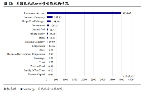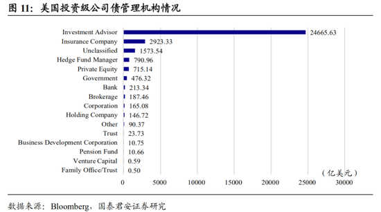 根据Bloomberg数据显示,截至2020年4月24日,在美国投资级公司债管理机构中,投资顾问(InvestmentAdvisor)是最大的一类持有人,占比为77%,其次是保险公司和对冲基金,占比分别为9.14%和2.47%。在美国,投资顾问需要获得注册投资顾问牌照(RIA牌照),只有具备RIA牌照的投资机构,才能在国内开展证券销售等业务,否则就只能通过拥有牌照的中间商进行交易;在获得监管机构审批后,美国的投资顾问可以代客购买股票和部分债券,还可以将资金拆借给共同基金等机构。需要说明的是,各类管理机构持有的投资级债券约3.2万亿美元,不到存量债券的一半,这主要是因为此处只统计了有披露管理机构类型的债券(下同)。