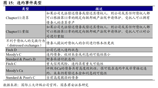 通常情况下,公司债券被认定为违约有三种情况:一是公司根据美国公司破产法第十一条申请清算或破产,二是公司发生了不利于债权人的交换行为(distressedexchanges),三是评级公司的评级下调。