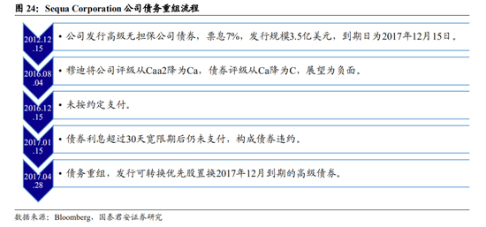 Sequa Corporation是一家为飞机引擎提供维修服务的公司,其债务全部于2017年到期,包括2017年6月到期的13亿美元贷款和2017年12月到期的3.5亿高级无担保债券,公司面临债务危机。2017年初,公司债券未按约定付息,形成实质性违约。2017年4月28日,公司通过发行可转换优先股的方式置换2017年12月到期债券,完成债务重组。
