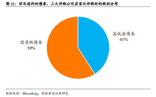 涉及违约的债券,国际三大评级公司首次评级时给予垃圾债级别的占比约41%。标普和惠誉评级在BB档及以下或者穆迪评级在Ba档及以下的债券,称之为垃圾债(高收益债),反之则称为投资级债券。若首次评级时,对应高收益债级别,则表明该只债券在发行时资质较差。我们统计了涉及违约的债券,在首次发行时,三大评级公司的评级情况。结果显示41%的债券在首次评级时获得垃圾债级别,59%的债券对应投资级别,相关发行主体可能由于经营不善,信用状况恶化,最终导致违约。需要说明的是,首次评级的级别分布只能反映部分问题,更重要的还是中间的预警过程。