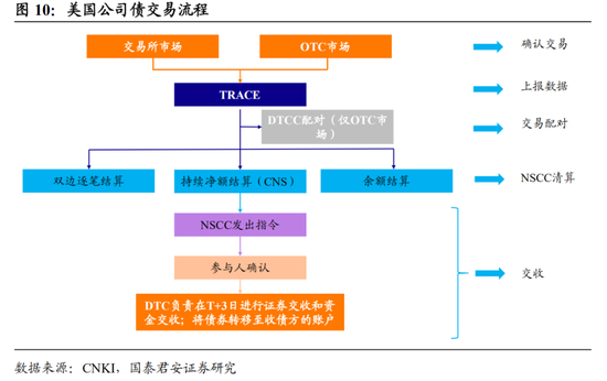 清算处理后进入交收环节。对于选择CNS结算方式的交易,参与人会收到NSCC发出的指令。交收指令得到确认后,DTCC旗下的证券集中托管公司(DTC)负责在T+3日进行证券交收和资金交收,以及将债券转移至收债方的账户。同时,如参与人是受基金等机构客户买卖债券的,参与人与客户之间也需要在DTC进行交收,具体为参与人及其客户向DTC发送债券和资金划转指令,DTC形成交易指令后发送给双方,双方确认之后方可进行划转手续。