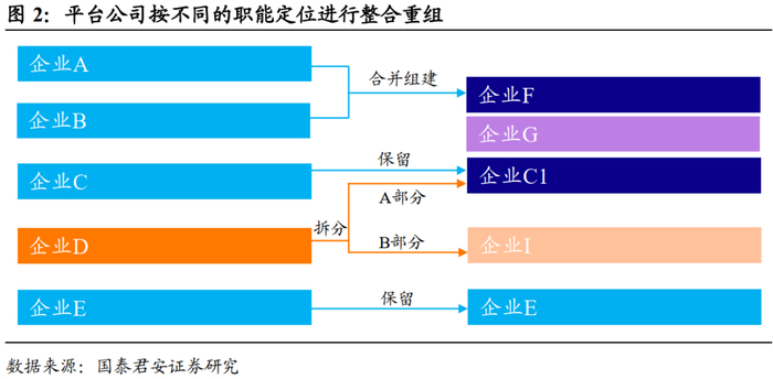 平台企业之间同质化经营的现象较为普遍,为提升效率,按业务职能进行重组是平台整合的主要目的之一。比如某市有两家企业A和B,A的传统优势在于城市道路建设领域,而B的传统优势在于土地一级开发整理,同时A和B均承接区域内保障房建设任务,并且没有明确的对应片区,此时A和B可能存在一定的竞争,不利于资源的最大化利用。为了使各家平台公司聚焦主业,职能定位更清晰,近年来政府通过整合以实现差异化经营,企业间分工更明确。我们认为差异化经营是平台公司整合的主要目的之一。比较典型的有:①重庆市政府从2002年开始,按职能统筹规划,逐步组建了建设、城投、地产、开投等八大政府性投资集团(“重庆八大投”);②2017年济南市政府按功能定位将原有的市级平台整合成济南城投、济南城建、济南文旅等六大投融资平台;③2018年云南省启动新一轮国企改革,出台“1+1+X”国企改革方案,旨在解决企业同质化经营问题;④2019年贵阳市按照不同的领域整合重组了贵阳城投、贵阳水务、贵阳城轨等十大集团公司。