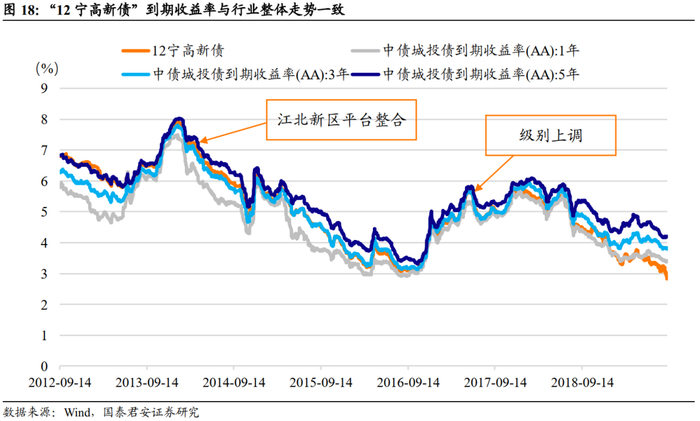 江北新区平台企业的债券收益率走势与行业整体趋势保持一致,整合的影响或很小。尽管相关主体的级别发生过上调,但从债券收益率走势看,“12宁高新债”收益率变化情况与行业整体走势基本一致,在整合时点和级别上调时点收益率未发生偏离趋势的情况(其他主体的债券有类似表现),平台整合对相关主体债券的二级市场估值未产生影响。
