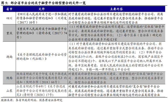 2008年4万亿刺激政策催生大批投融资平台,各地平台数量多且杂,同质化经营现象严重,近年来平台整合愈发普遍,针对平台整合的影响我们有如下思考: