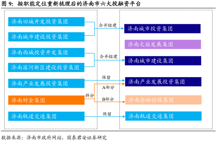 2017年5月,济南市政府将旧的投融资平台按功能属性进行整合调整,组建城市投资集团和城市建设集团、成立金融控股集团和文旅发展集团、保留产业发展投资集团和轨道交通集团,同时,不再保留财金集团,将其业务按属性分别划转至产业发展投资集团和金融控股集团。整合后的六大投融资平台业务差异化明显,职能定位清晰,各平台统筹运营能力大幅增强。