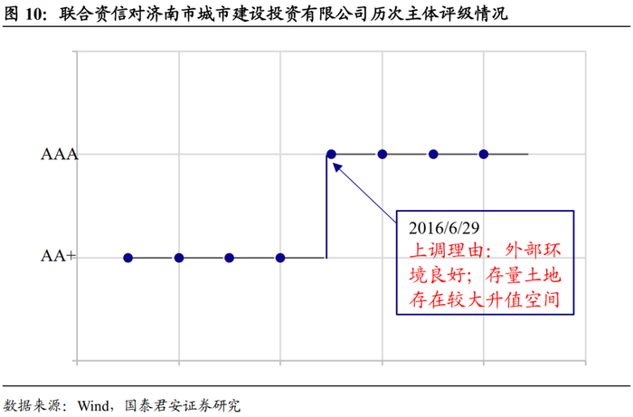 相关主体评级上调发生在整合前。济南市级平台家数较多,但整合前公开发债的平台仅济南市城市建设投资有限公司和济南西城投资开发集团有限公司,联合资信对这两家主体的级别均在2016年由AA+上调至AAA,或与2016年宽松的融资环境有关。