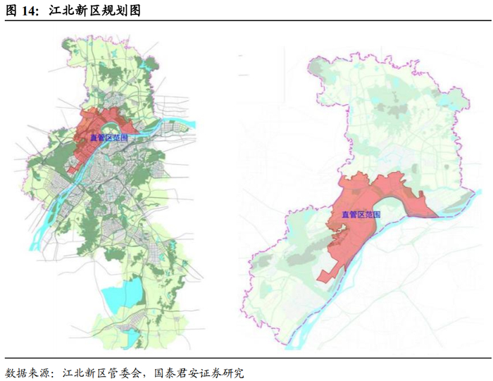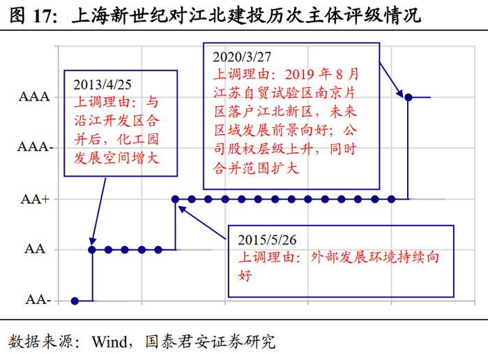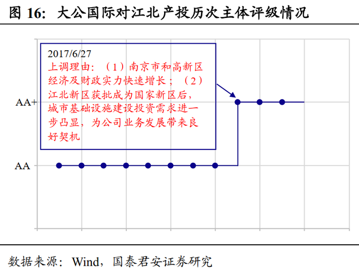 受益于江北新区良好的发展势头,区内部分平台获得级别上调。扬子国资首次评级就获得AAA级别,子公司江北产投在2017年主体级别由AA上调至AA+;另一家子公司江北建投主体级别先后经历三次上调,目前为AAA;此外,江北公用经营较为稳定,级别未调整。整体看,依托江北新区高战略定位和良好的发展势头,区内部分平台企业获得级别上调,但调级时点滞后于整合时点,我们认为或是因为成立初期尚存不确定性,经过几年发展,区域优势逐步显现,才在级别上给予反映。近年来江北新区发展势头强劲,2019年直管区实现GDP1800.99亿、一般公共预算收入186.6亿、政府性基金收入260.2亿,政府债务余额218.9亿,整体实力很强。