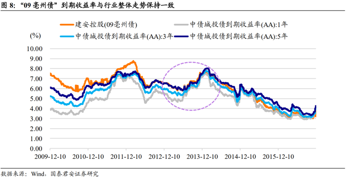 建安控股债券收益率与行业整体走势保持一致,整合事件影响或很小。从具体个券收益率走势看,“09亳州债”在整合期间(2012-2014)收益率的变化情况与中债城投债到期收益率整体走势较为一致,尽管中证鹏元在2014年8月份将债券级别由AA上调至AA+,导致小波段内该只债券收益率下行速度快于行业整体水平,但上调级别主要是受债券担保主体的信用资质变化影响,与整合无关。