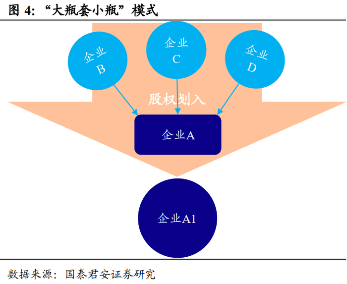 指定一家较大的平台作为股权接收主体,通常该平台在区域内地位突出。该模式与企业合并当中的“控股合并”相类似,典型例子如建安控股。“大瓶套小瓶”模式的优点在于业务磨合期较短,地方政府直接选取当地较大的一家平台作为股权接收主体,将其他平台的股权直接划转至该企业,由于旧的平台已有较为规范的业务运营模式,可省去母子公司间的业务磨合,保证各平台业务顺畅运转。劣势在于人员管理机制调整面临一定压力,以现有企业作为股权接收主体,其领导班子作为新成立集团管理层的可能性或较大,这导致以前同层级公司出现管理层人员行政级别的差异,短期内协调效率偏低,人员管理机制需要进一步理顺。