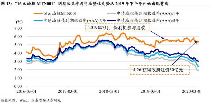 保利集团拟参与混改之后云南城投债券收益率却小幅上升,与行业整体走势相背离,但近期政府注资后收益率下行明显。2019年下半年以来,受益于城投行业融资环境持续宽松,AAA级各期限中债城投债到期收益率处于下行通道,反观“16云城投MTN001”(其他债券表现类似),其收益率在该时间段内却小幅上升,我们认为一方面是由于混改迟迟未得到推进,另一方面还与云南城投自身经营不善、债务负担偏重、短期流动性压力加大、出售旗下资产偿还债务和补流以及高管被查等负面舆情有关。4月22日,在云南城投发债交易路演上,云南省政府表示将以医疗、文旅等资产对云南城投进行注资,2020年现金注资额将在100亿元或以上;4月26日,公司已获得政府注资30亿元,当天“16云城投MTN001”(剩余期限1年左右)收益率下行4.2BP,而AAA级1年期中债城投债到期收益率却微升,注资对债券估值的影响或较大。