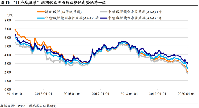 济南市级平台整合对相关债券收益率影响或很小。从相关债券收益率走势看,“14济城投债”收益率走势与中债城投债到期收益率保持一致。2016年主体调级和2017年平台整合对债券收益率未产生偏离趋势的扰动。同时,济南西城投资开发集团有限公司所发行的债券“15济西城投MTN001”亦表现出相同走势。尽管平台整合释放出一定利好消息,但由于相关主体信用资质原本就很好,债券收益率处于较低水平,因此整合事件不足以对债券估值产生影响。