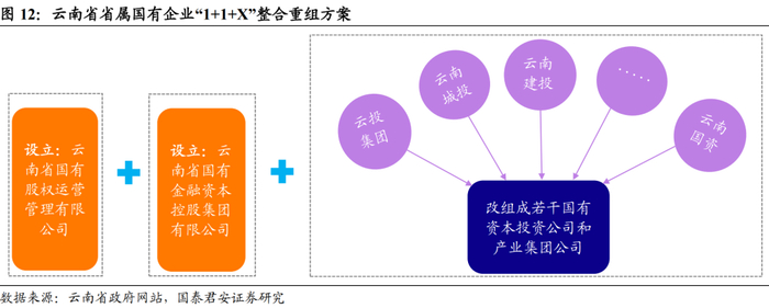 2018年底云南省政府发布《云南省深化国有企业改革三年行动方案(2018-2020年)》,旨在解决国有企业同质化经营、资产负债率偏高、管理层级过多等问题,提升企业效益,2019年基本完成省属企业“1+1+X”的整合框架,2020年“1+1+X”框架进一步完善并运行顺畅,同时基本完成州(市)和县(市、区)国企整合重组。