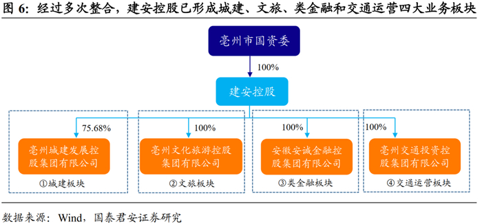 建安控股是亳州市最重要的基础设施建设主体和国有资产运营主体,现已形成城建、文旅、类金融和交通运营四大板块。建安控股是在2002年9月成立的原亳州建设投资集团有限公司基础上,经过多次整合组建而成,具体整合历程如下:2012年12月,亳州市国资委将谯城区财政局所持的亳州金地建设投资有限公司51%股权无偿划转入公司;2013年11月,亳州市国资委将涡阳县财政局所持涡阳县金阳城市建设投资有限公司51%股权、蒙城县财政局所持蒙城县漆园城市建设投资有限公司51%股权和利辛县财政局所持利辛县城乡建设投资有限公司51%股权无偿划入;2014年6月,政府将亳州药都地产开发投资有限责任公司(现已更名为亳州城建发展控股集团有限公司)、亳州市交通建设投资有限责任公司、亳州市文化旅游发展有限责任公司、亳州市公共交通有限责任公司股权无偿划入公司。经过上述多次整合,建安控股现已形成城建、文旅、类金融和交通运营四大板块,市场化转型方向渐明确。