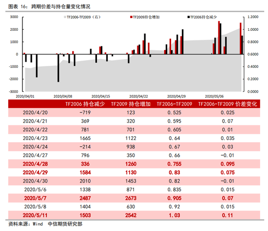 进一步观察TF2006合约移仓换月期跨期价差的变化,可以发现:跨期价差显著走扩的日期往往伴随着TF2009持仓量的显著上升。也就是说,本轮跨期价差走扩的背后的驱动力更多来自于远月合约的显著走弱。