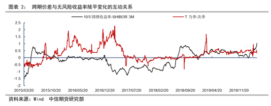 理论上看,如果忽略国债期货的交割期权价值,以及当季和次季合约CTD可能切换的问题,当季合约和次季合约跨期价差可近似看作次季合约比当季合约多持有3个月CTD券的持有收益。因此,无风险收益率的陡平,特别是资金成本的变动,对于跨期价差的理论价格将产生明显影响。这一点从长周期维度可以得到一定印证,10年期国债期货跨期价差的中枢与10年期收益率-3个月Shibor利差存在正向互动关系。