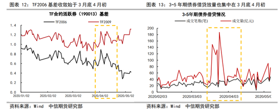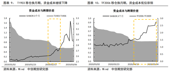 与T1903移仓换月期间资金成本仍在持续下行不同,TF2006移仓换月期资金成本进入低位徘徊期,3个月Shibor利率在4月17日之后便维持在1.4%附近未能进一步向下突破。这也就意味着,资金利率下行带来持有收益上升对于跨期价差的推动,更多体现在TF2006合约移仓换月期之前那段时间,对应来看,大概是TF2006-TF2009跨期价差从此前0.35~0.37元左右的水平扩大至4月底合约移仓换月前0.525元的时期。4月22日之后TF2006合约真正开始移仓换月时,跨期价差的从0.525元走扩至最高0.94元可能更多与多空矛盾的体现有关。