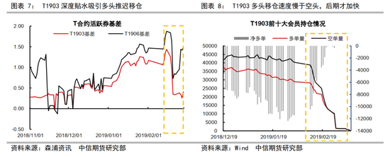 二是当季合约深贴水吸引反套介入,多头主动推迟移仓,空头被动移仓。在春节假期归来后,即2月11日之后,T1903合约依然高达1元以上基差水平是吸引多头积极介入反套策略并推迟移仓等待基差收敛的源动力。在此情况下,多头主动推迟移仓,而空头被动移仓的多空矛盾显露,跨期价差跟随显著上涨。数据上看,直至2月19日T1903合约基差迅速收敛之后,多头移仓速度才明显加快。