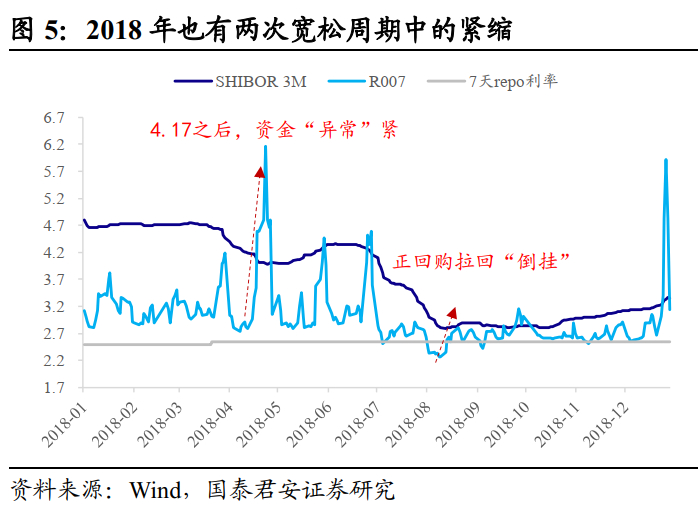 比如,2018年全年来看,资金利率中枢不断下沉,且波动趋于收敛。但也出现了两次明显的宽松周期中的紧缩,一次是“417”降准后资金利率一路走高,央行却未积极对冲,反过来加剧市场资金“惜售”情绪;另一次是8月份市场利率与政策利率倒挂,事后证实央行进行了正回购操作。