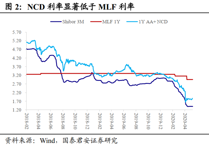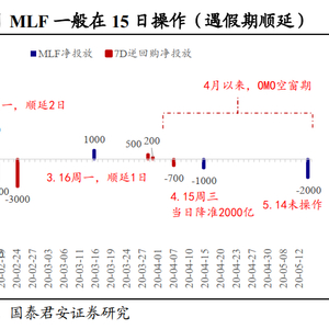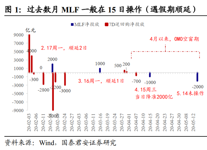 我们认为可能的原因有两个:其一,“时机未到”,2020年以来MLF操作集中在每月中旬,若遇假期则顺延至下一周;其二,“没人想要”,MLF由银行按需报量,而2020年以来,资金成本快速下行,当前1年期AA+存单利率已经低于同期限MLF利率超100bp,对于银行而言似乎有些“鸡肋”。无论哪个原因都无法给出一个相对明确的预测。