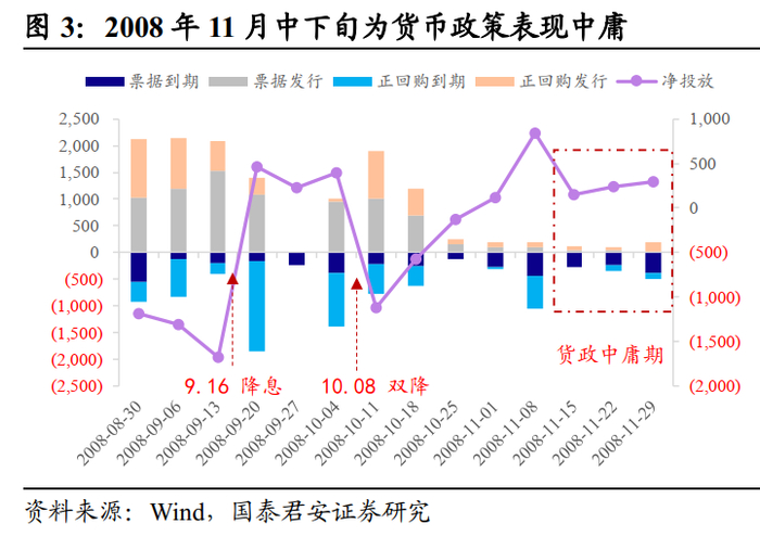 比如,(如图3)2008年9-10月降准降息操作密集落地,11月中下旬货币政策信号不强,苦等降息未至导致市场陷入焦虑。而恰逢当月利率供给放量,多头顺势“缴械”,导致短短8个交易日内,10年国债利率累计上行31bp。