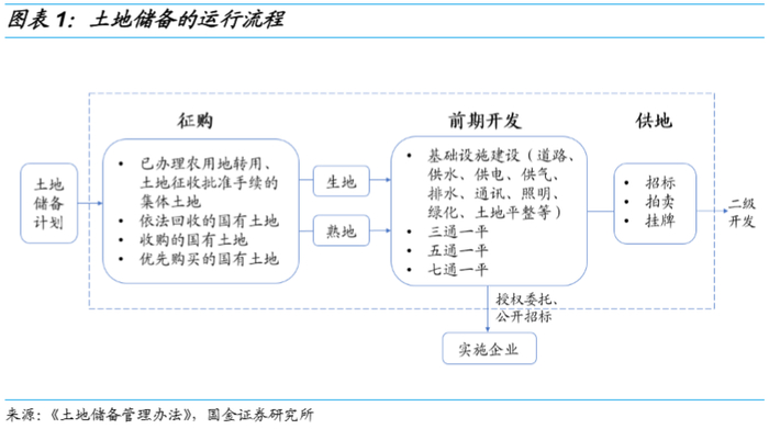 储备土地的前期开发应按照该地块的规划,完成地块内的道路、供水、供电、供气、排水、通讯、围挡等基础设施建设,并进行土地平整,满足必要的“通平”要求。土地储备的流程主要包括征购、储备和工地三大环节。