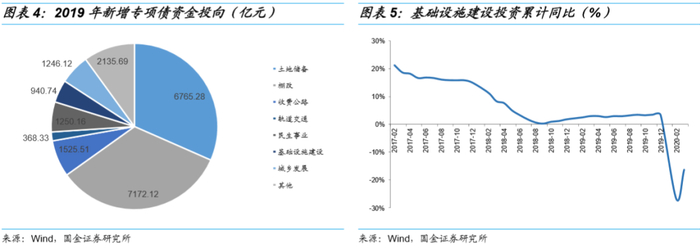 随着经济下行压力不断加大,19年9月4日国常会和20年4月3日国新办新闻发布会都明确2020年政府专项债不用于土地收储,我们认为,这是经济下行压力下的应急之举,意在引导专项债投向基建领域,促使基建投资增速回升,从而发挥对经济的有效拉动作用。