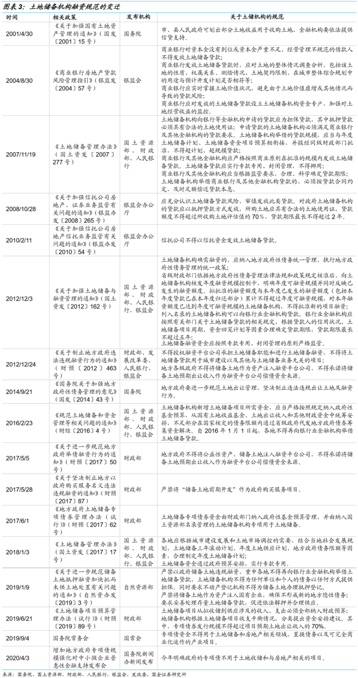 2001年国务院《关于加强国有土地资产管理的通知》(国发〔2001〕15号)规定市、县人民政府可划出部分土地收益用于收购土地,金融机构要依法提供信贷支持。该文明确了金融机构(包括银行和非银金融机构)可以为土地收储提供融资。