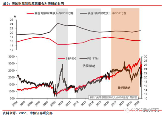 以美国的财政货币化进程和美股为参考,财政扩张正向作用于盈利,货币扩张正向作用于估值,财政货币化能够对股市形成双重利好,货币宽松的作用更强。